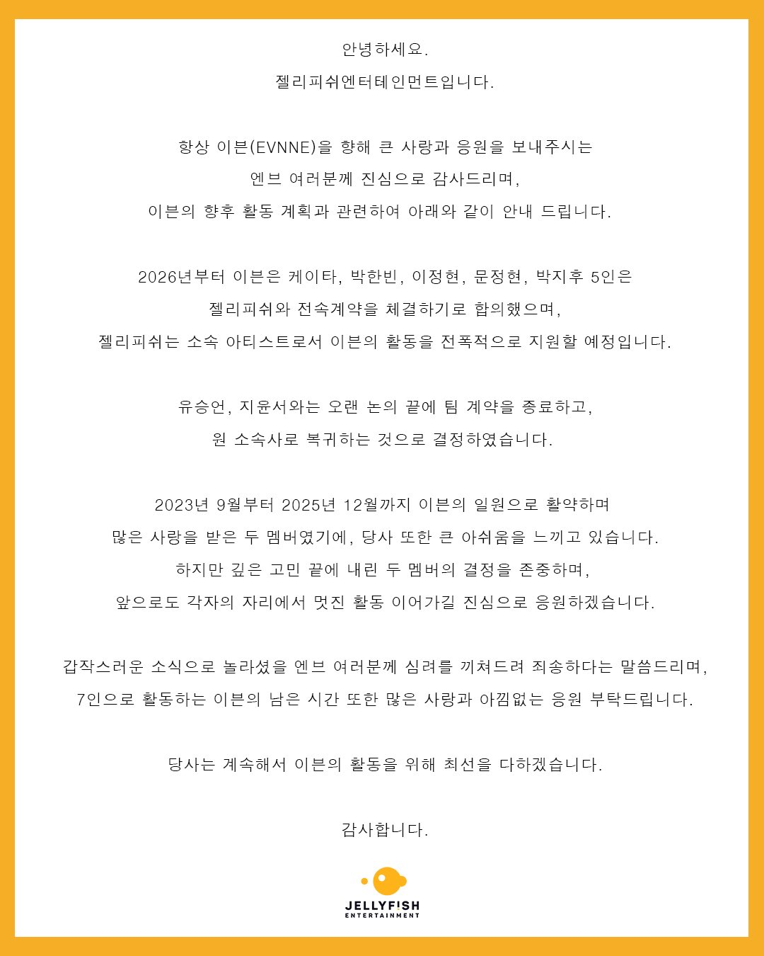 La agencia también se dirigió a ENNVE, el fandom del grupo y reconocieron que la noticia fue repentina y pidieron comprensión a los seguidores. Afirmaron que EVNNE continuará promocionando como siete hasta diciembre de 2025. Luego, el proyecto se consolidará como un grupo regular bajo el sello Jellyfish.